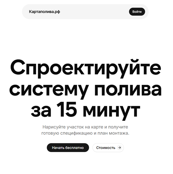 Это краткая инструкция по работе с сервисом картаполива.рф. Сервис помогает спроектировать систему капельного полива: нарисовать участок на карте, задать параметры полива, разбить участок на поливные блоки, провести гидравлический расчёт, получить готовую спецификацию и план монтажа. Всё можно сделать за 15 минут.